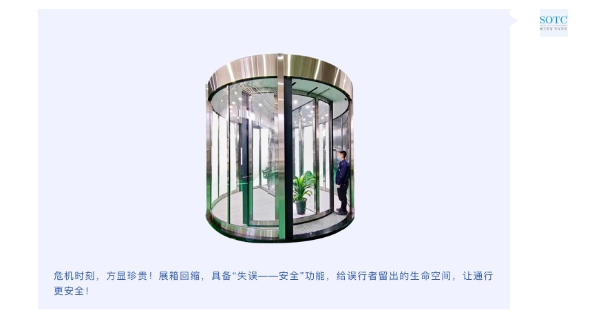 The ultimate in safety - SOTC exhibition box retracts without trapping people in the revolving door. Based on the traditional preventive safety protection, the safety upgrade has been carried out, and it has the "error-safety" protection function, even in the case of wrong passage. If you are accidentally caught under the revolving door, the innovative structure of the revolving door itself can also be easily pushed open, resulting in a 280mm safety avoidance gap, which can completely accommodate one person without causing any more clamping damage. (especially children and seniors) quite friendly.