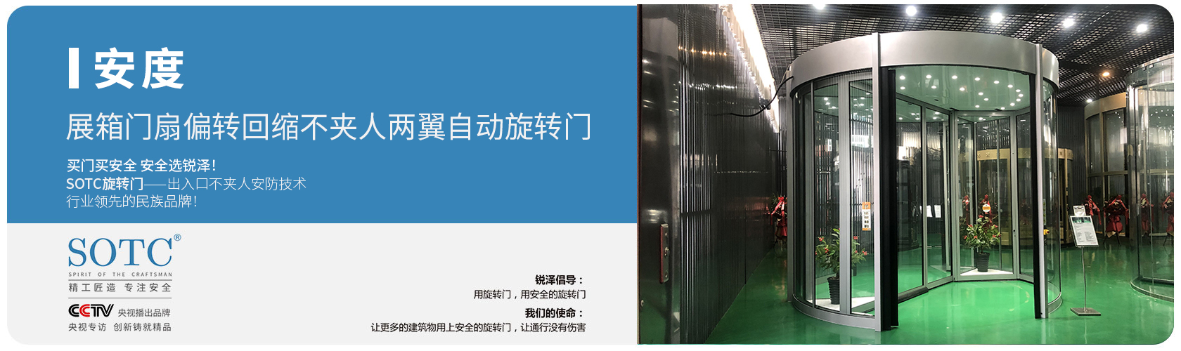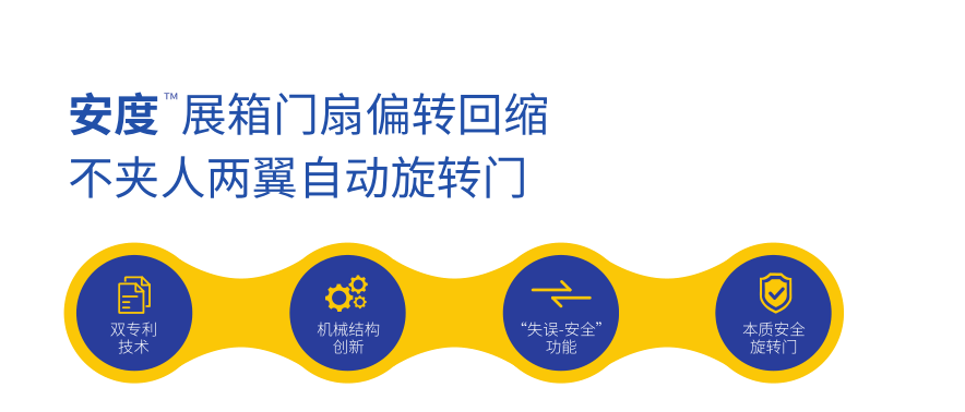 安度-展箱门扇偏转回缩不夹人两翼自动旋转门,是在展箱回缩不夹人技术基础上的保护功能升级,配合展箱回缩不夹人技术形成旋转门入口对行人的复合保护功能,通过展箱前梃活动扇受冲击力后的偏转回缩吸能,同时触发展箱整体回缩联动,从机械结构上彻底解决了入口对行人的冲击力伤害和夹持伤害问题。